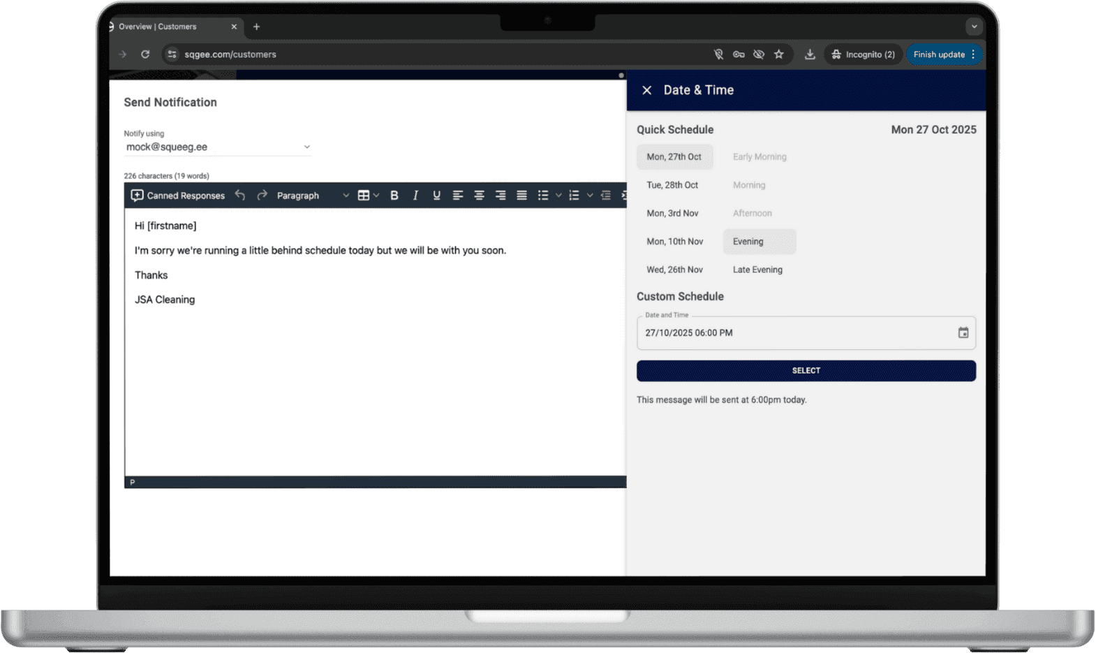 Managing messages across text, email, WhatsApp and Messenger can quickly become overwhelming. Squeegee brings all your customer conversations into one easy-to-use platform, so you never miss a message and always reply on time. With personalised templates, 2-way messaging, and automated alerts, staying connected has never been simpler.